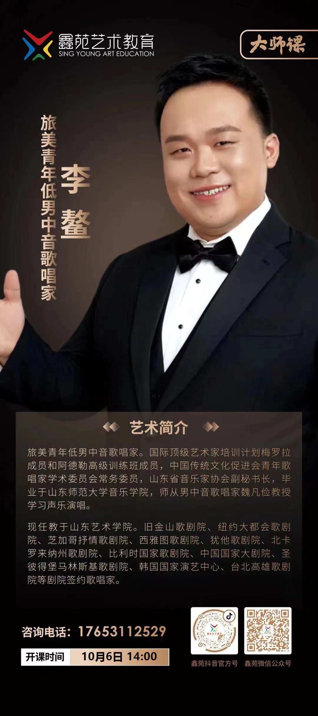 鑫苑艺术学校邀请旅美青年低男中音歌唱家、十二届中国音乐金钟奖美声组冠军、山东艺术学院教授李鳌,于丽山·鑫苑音乐厅举行大师面对面授课活动,特邀各界声乐艺术爱好者参加!